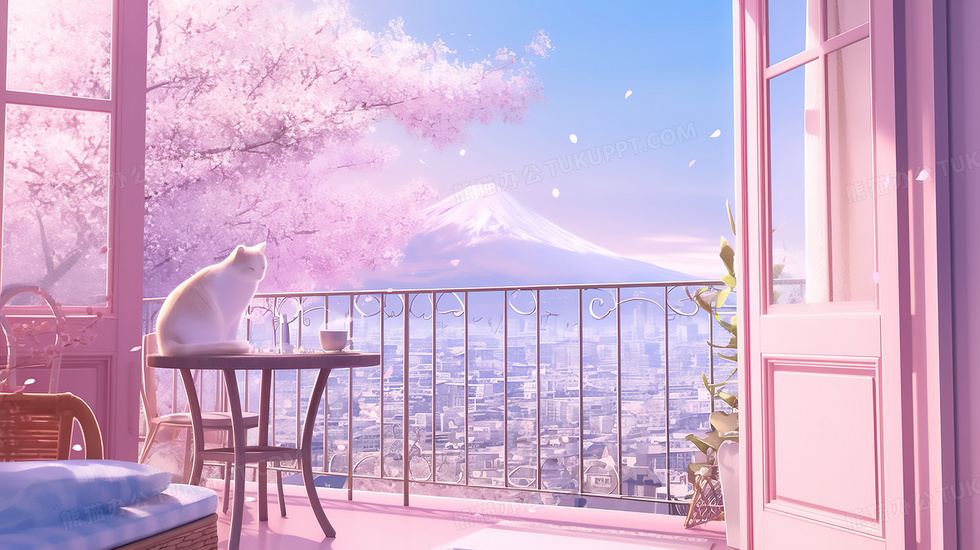 本作品内容为卡通唯美梦幻粉色阳台猫插画, 格式为 jpg, 大小3 MB, 图片尺寸为2912 x 1632, 源文件无水印, 欢迎使用熊猫办公。 如认为平台内容涉嫌侵权,可通过邮件:tousu@tukuppt.com提出书面通知,我们将及时处理。