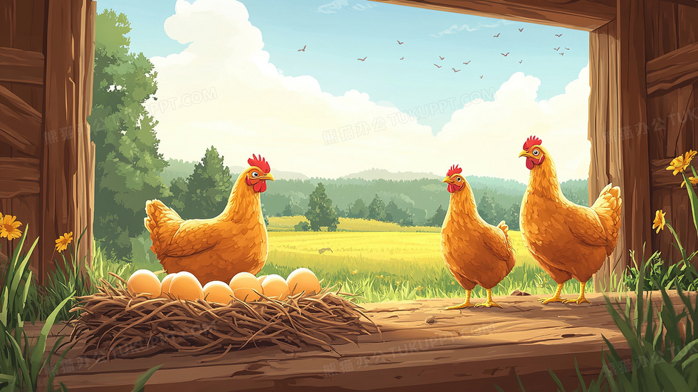 本作品内容为农场牧场内农业养殖下蛋的鸡插画, 格式为 jpg, 大小3 MB, 图片尺寸为2912 x 1632, 源文件无水印, 欢迎使用熊猫办公。 如认为平台内容涉嫌侵权,可通过邮件:tousu@tukuppt.com提出书面通知,我们将及时处理。
