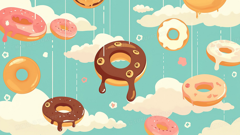 本作品内容为漂浮在天空中的甜甜圈零食插画, 格式为 jpg, 大小2 MB, 图片尺寸为2912 x 1632, 源文件无水印, 欢迎使用熊猫办公。 如认为平台内容涉嫌侵权,可通过邮件:tousu@tukuppt.com提出书面通知,我们将及时处理。