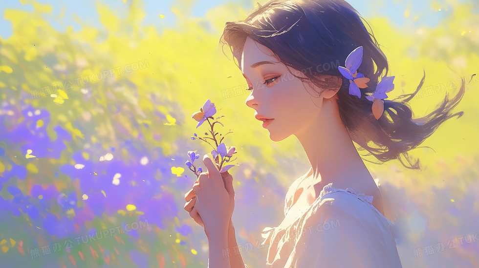 本作品内容为闻花香的美女治愈系唯美插画, 格式为 jpg, 大小3 MB, 图片尺寸为2912 x 1632, 源文件无水印, 欢迎使用熊猫办公。 如认为平台内容涉嫌侵权,可通过邮件:tousu@tukuppt.com提出书面通知,我们将及时处理。