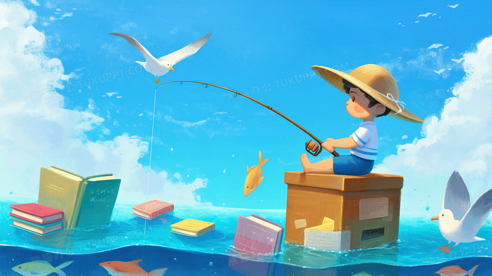 本作品内容为坐在海洋书本上钓鱼的卡通男孩插画, 格式为 jpg, 大小3 MB, 图片尺寸为2912 x 1632, 源文件无水印, 欢迎使用熊猫办公。 如认为平台内容涉嫌侵权,可通过邮件:tousu@tukuppt.com提出书面通知,我们将及时处理。