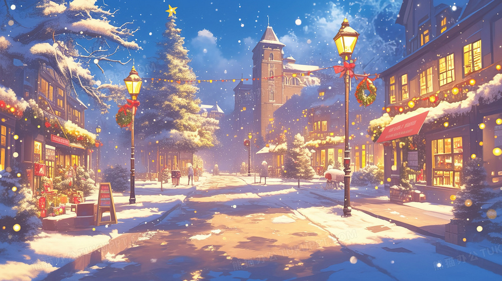 本作品内容为圣诞节冬天夜景街道装饰氛围唯美插画, 格式为 jpg, 大小3 MB, 图片尺寸为2912 x 1632, 源文件无水印, 欢迎使用熊猫办公。 如认为平台内容涉嫌侵权,可通过邮件:tousu@tukuppt.com提出书面通知,我们将及时处理。