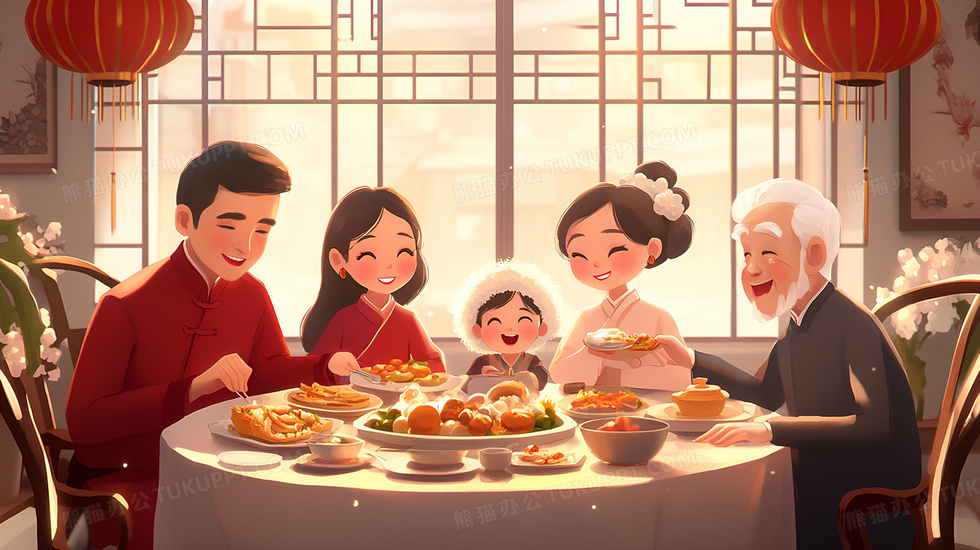 本作品内容为春节一家人吃团圆饭插画, 格式为 jpg, 大小1 MB, 图片尺寸为2912 x 1632, 源文件无水印, 欢迎使用熊猫办公。 如认为平台内容涉嫌侵权,可通过邮件:tousu@tukuppt.com提出书面通知,我们将及时处理。