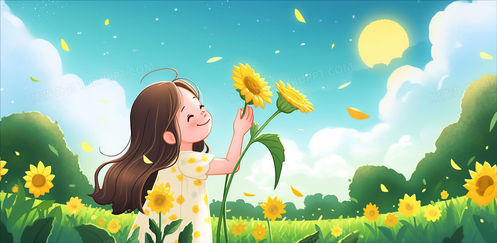 本作品内容为开心的小女孩手拿向日葵插画图片, 格式为 jpg, 大小2 MB, 图片尺寸为2908 x 1420, 源文件无水印, 欢迎使用熊猫办公。 如认为平台内容涉嫌侵权,可通过邮件:tousu@tukuppt.com提出书面通知,我们将及时处理。