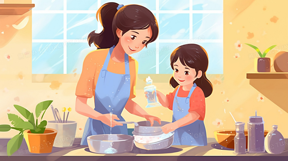 本作品内容为一起刷碗的母女俩精美创意插画, 格式为 jpg, 大小4 MB, 图片尺寸为2912 x 1632, 源文件无水印, 欢迎使用熊猫办公。 如认为平台内容涉嫌侵权,可通过邮件:tousu@tukuppt.com提出书面通知,我们将及时处理。