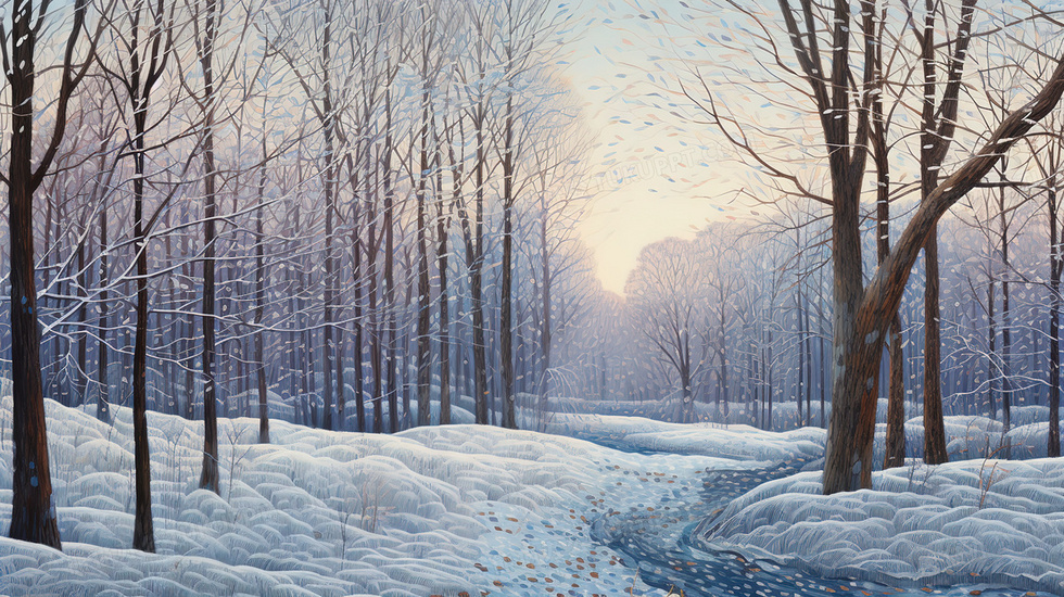 首页 > 插画 > 科技艺术 > 水彩手绘 > 冬季雪地森林溪流唯美雪景插画