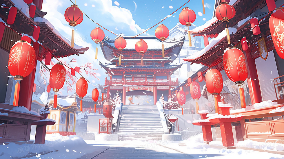 春节张灯结彩的积雪古镇插画