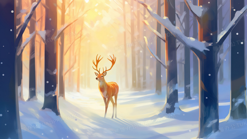 本作品内容为冬季森林中阳光下的小鹿插画, 格式为 jpg, 大小5 MB, 图片尺寸为2912 x 1632, 源文件无水印, 欢迎使用熊猫办公。 如认为平台内容涉嫌侵权,可通过邮件:tousu@tukuppt.com提出书面通知,我们将及时处理。