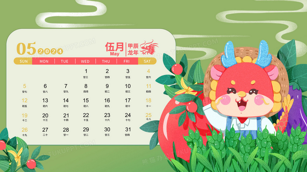 本作品内容为2024年龙年日历5月台历插画, 格式为 psd, 大小39 MB, 请使用软件PhotoShop(CC)打开, 源文件无水印, 欢迎使用熊猫办公。 如认为平台内容涉嫌侵权,可通过邮件:tousu@tukuppt.com提出书面通知,我们将及时处理。