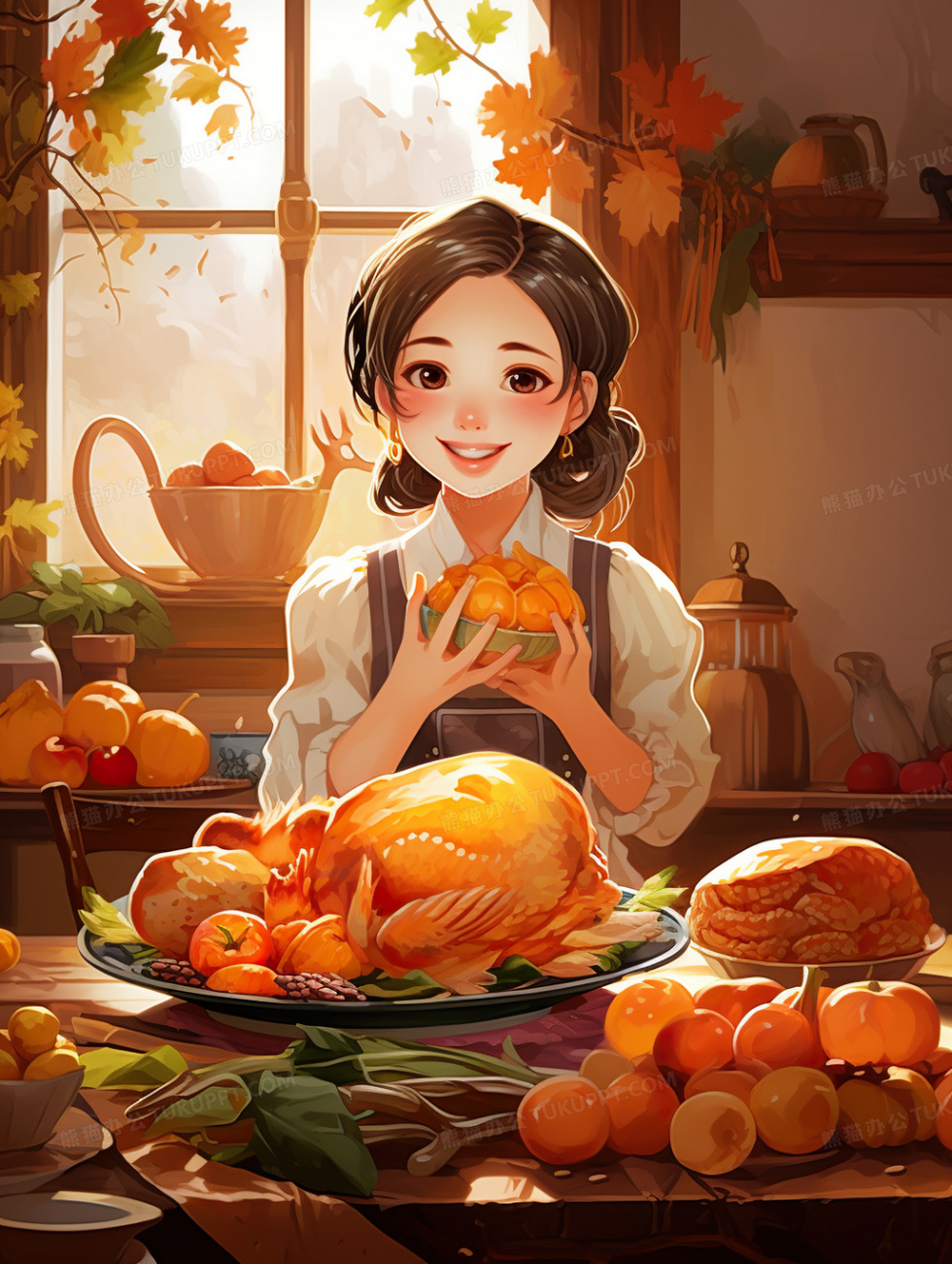本作品内容为感恩节女孩烤鸡美食插画, 格式为 jpg, 大小5 MB, 图片尺寸为1760 x 2336, 源文件无水印, 欢迎使用熊猫办公。 如认为平台内容涉嫌侵权,可通过邮件:tousu@tukuppt.com提出书面通知,我们将及时处理。