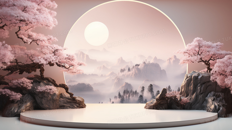 本作品内容为圆月山水粉梅古典电商展示台概念图片, 格式为 jpg, 大小7 MB, 图片尺寸为2912 x 1632, 源文件无水印, 欢迎使用熊猫办公。 如认为平台内容涉嫌侵权,可通过邮件:tousu@tukuppt.com提出书面通知,我们将及时处理。