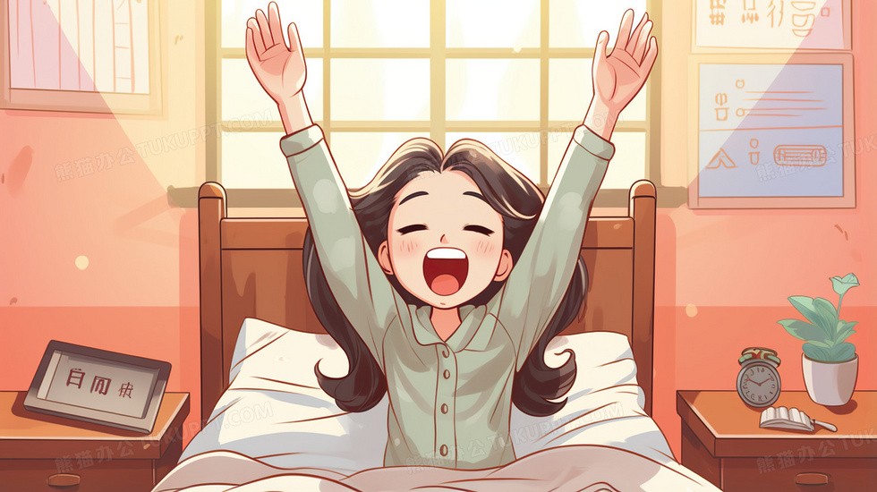 本作品内容为假期起床伸懒腰睡懒觉惬意场景插画, 格式为 jpg, 大小5 MB, 图片尺寸为2912 x 1632, 源文件无水印, 欢迎使用熊猫办公。 如认为平台内容涉嫌侵权,可通过邮件:tousu@tukuppt.com提出书面通知,我们将及时处理。