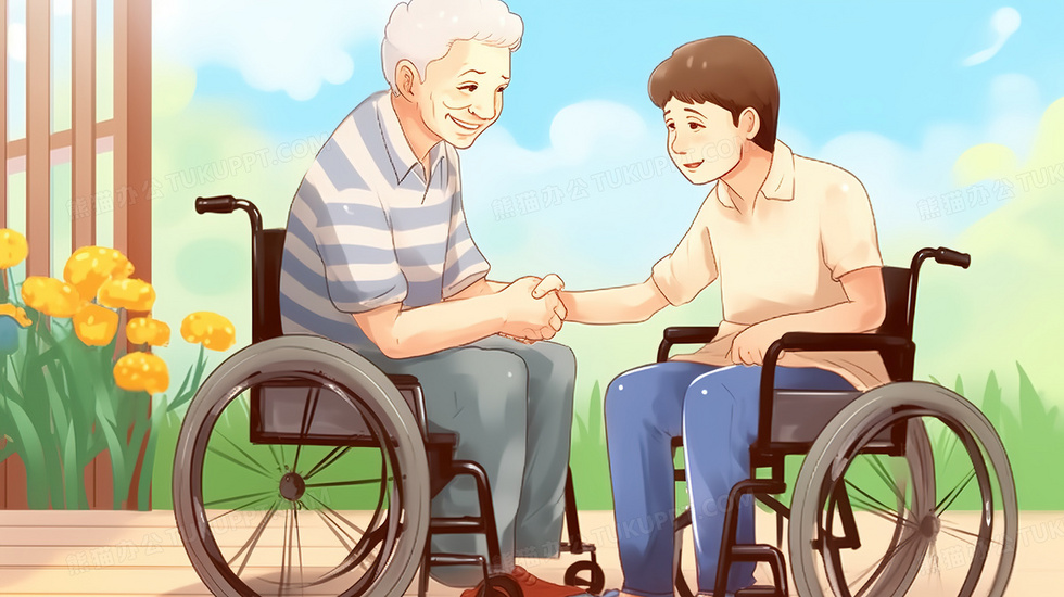 本作品内容为老人陪伴坐轮椅的年轻人温馨插画, 格式为 jpg, 大小5 MB, 图片尺寸为2912 x 1632, 源文件无水印, 欢迎使用熊猫办公。 如认为平台内容涉嫌侵权,可通过邮件:tousu@tukuppt.com提出书面通知,我们将及时处理。
