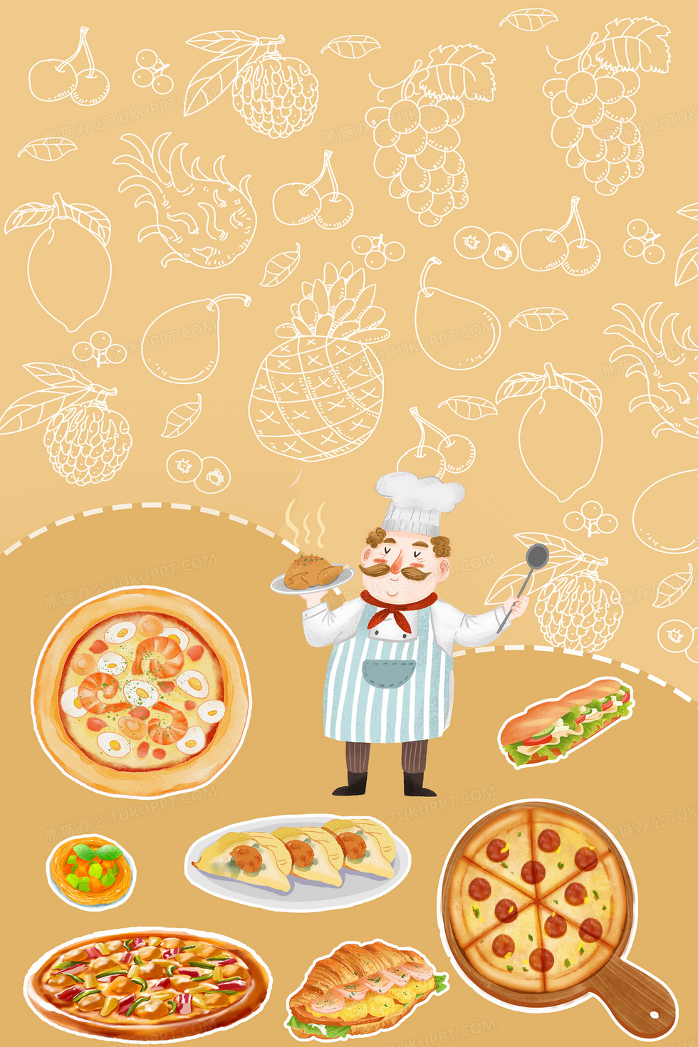 本作品内容为卡通厨师食物合成背景, 格式为 psd, 大小40 MB, 图片尺寸为3543 x 5314, 作品中背景图片无需修改, 源文件无水印,可以直接使用, 欢迎使用熊猫办公。 如认为平台内容涉嫌侵权,可通过邮件:tousu@tukuppt.com提出书面通知,我们将及时处理。