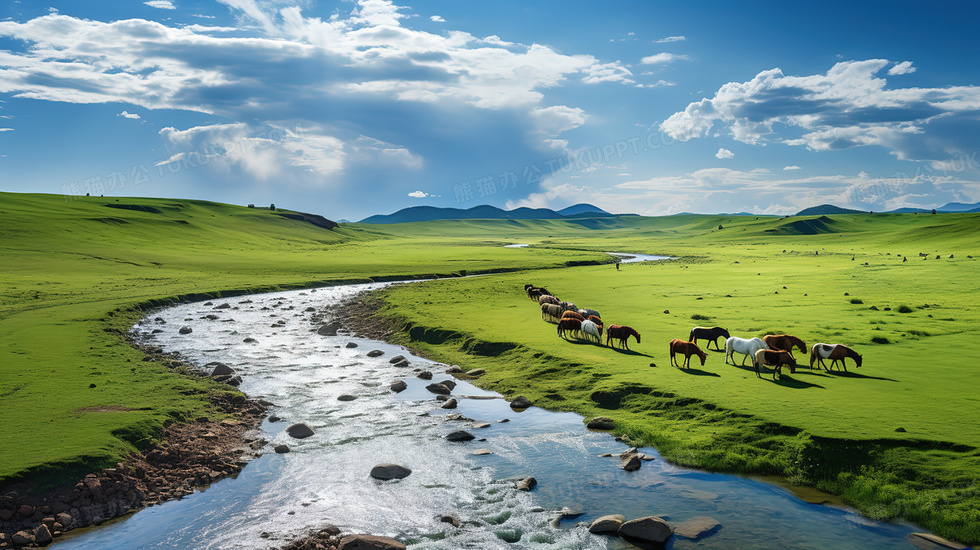本作品内容为蓝天白云草原上在河边休息的马匹风景图片, 格式为 jpg, 大小8 MB, 图片尺寸为2912 x 1632, 源文件无水印, 欢迎使用熊猫办公。 如认为平台内容涉嫌侵权,可通过邮件:tousu@tukuppt.com提出书面通知,我们将及时处理。