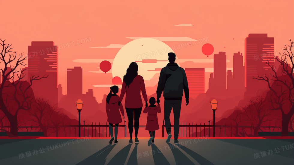 本作品内容为黄昏时分一家人外出散步温馨插画, 格式为 jpg, 大小4 MB, 图片尺寸为2912 x 1632, 源文件无水印, 欢迎使用熊猫办公。 如认为平台内容涉嫌侵权,可通过邮件:tousu@tukuppt.com提出书面通知,我们将及时处理。