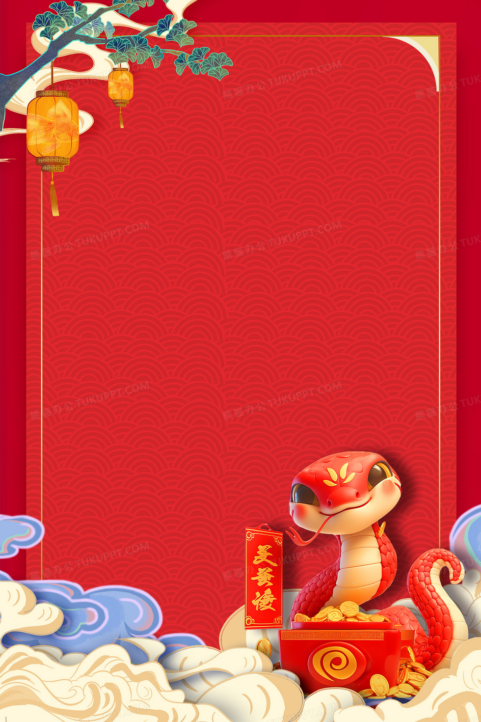 本作品内容为蛇年新年国潮风喜庆新年背景, 格式为 psd, 大小49 MB, 图片尺寸为3543 x 5315, 作品中背景图片无需修改, 源文件无水印,可以直接使用, 欢迎使用熊猫办公。 如认为平台内容涉嫌侵权,可通过邮件:tousu@tukuppt.com提出书面通知,我们将及时处理。