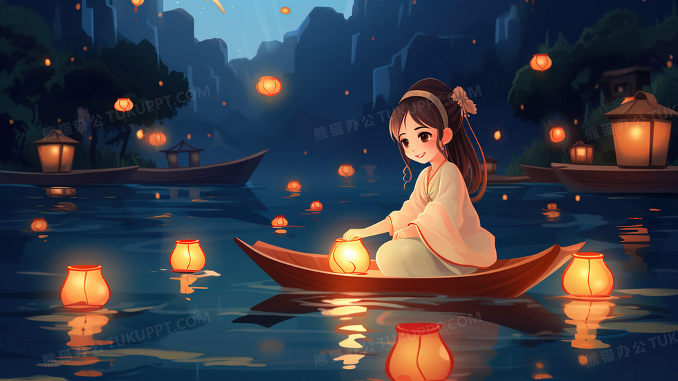 本作品内容为小船上放花灯祈福的少女插画, 格式为 jpg, 大小4 MB, 图片尺寸为2912 x 1632, 源文件无水印, 欢迎使用熊猫办公。 如认为平台内容涉嫌侵权,可通过邮件:tousu@tukuppt.com提出书面通知,我们将及时处理。