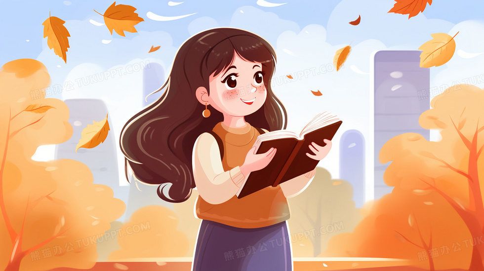 本作品内容为秋天枫树下拿着课本的女孩插画, 格式为 jpg, 大小4 MB, 图片尺寸为2912 x 1632, 源文件无水印, 欢迎使用熊猫办公。 如认为平台内容涉嫌侵权,可通过邮件:tousu@tukuppt.com提出书面通知,我们将及时处理。