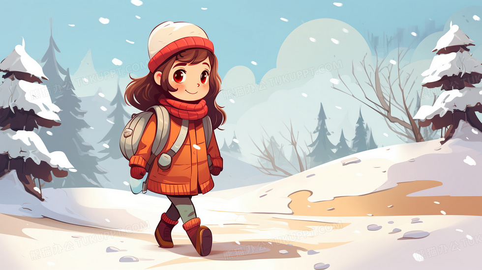 本作品内容为卡通女孩冬天在雪地散步行走场景插画, 格式为 jpg, 大小5 MB, 图片尺寸为2912 x 1632, 源文件无水印, 欢迎使用熊猫办公。 如认为平台内容涉嫌侵权,可通过邮件:tousu@tukuppt.com提出书面通知,我们将及时处理。