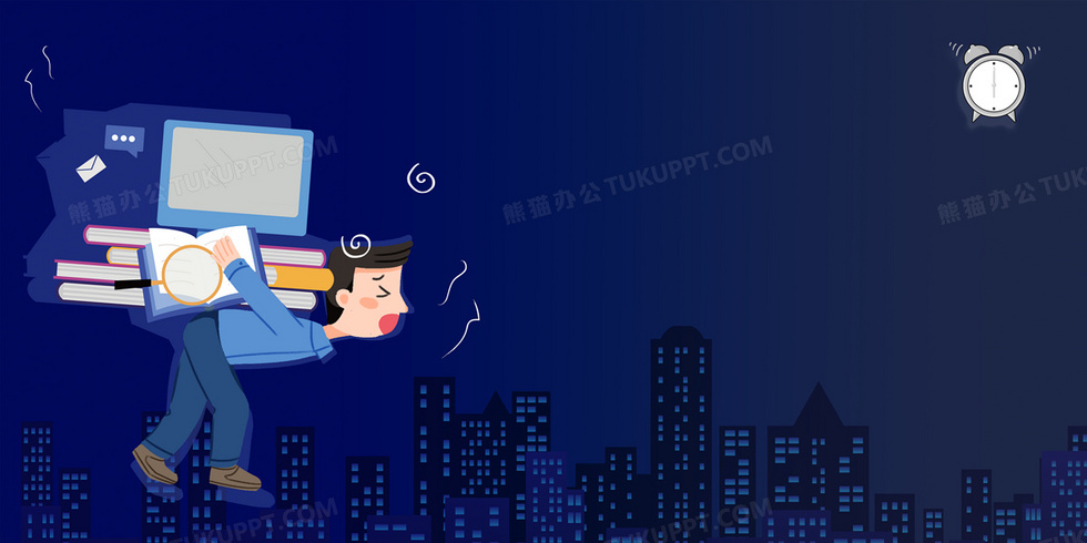 本作品内容为加班压力大背景, 格式为 psd, 大小44 MB, 图片尺寸为4724 x 2362, 作品中背景图片无需修改, 源文件无水印,可以直接使用, 欢迎使用熊猫办公。 如认为平台内容涉嫌侵权,可通过邮件:tousu@tukuppt.com提出书面通知,我们将及时处理。