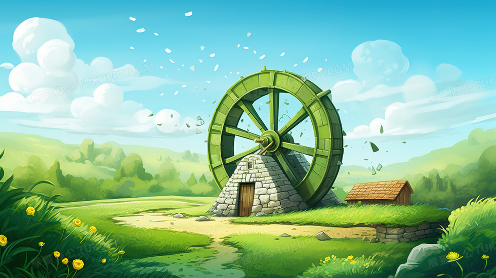 本作品内容为春季稻田里的水车插画, 格式为 jpg, 大小6 MB, 图片尺寸为2912 x 1632, 源文件无水印, 欢迎使用熊猫办公。 如认为平台内容涉嫌侵权,可通过邮件:tousu@tukuppt.com提出书面通知,我们将及时处理。