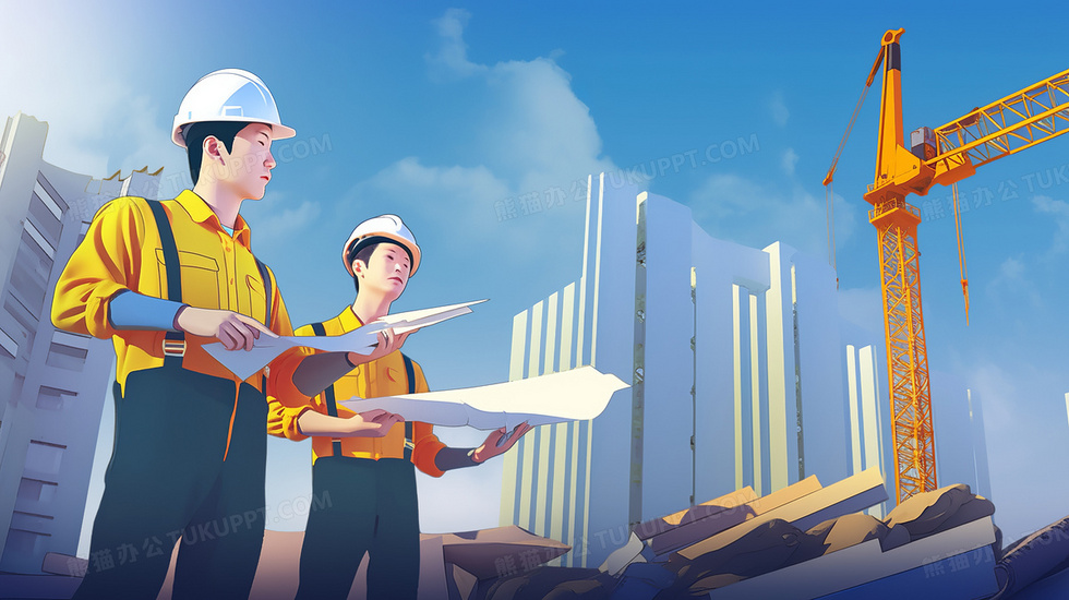 本作品内容为2个戴着安全头盔穿着专业的工程师在建筑工地监督施工情况创意插画, 格式为 jpg, 大小3 MB, 图片尺寸为2912 x 1632, 源文件无水印, 欢迎使用熊猫办公。 如认为平台内容涉嫌侵权,可通过邮件:tousu@tukuppt.com提出书面通知,我们将及时处理。