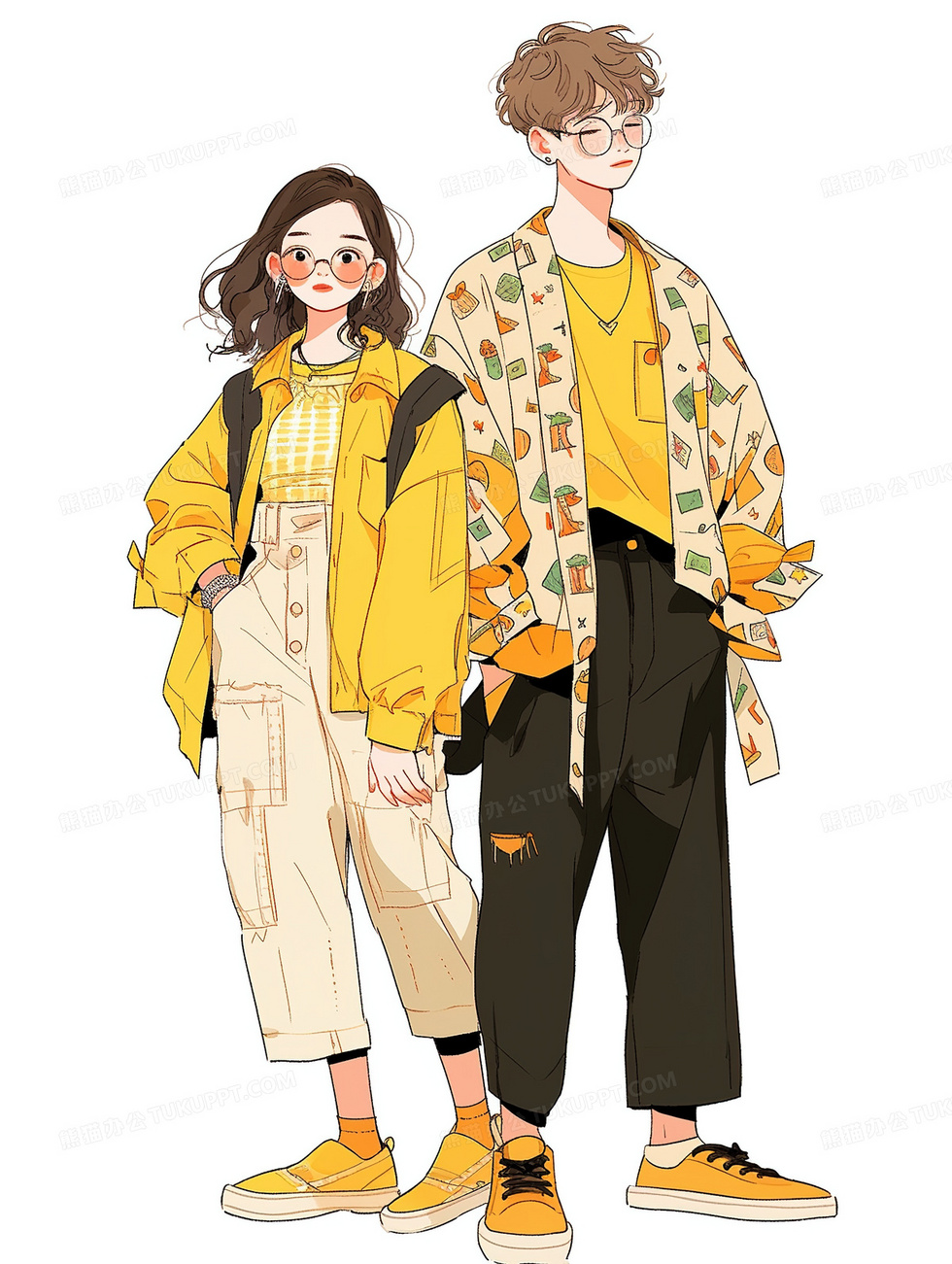 本作品内容为卡通青春时尚情侣装人物插画, 格式为 jpg, 大小4 MB, 图片尺寸为1856 x 2464, 源文件无水印, 欢迎使用熊猫办公。 如认为平台内容涉嫌侵权,可通过邮件:tousu@tukuppt.com提出书面通知,我们将及时处理。