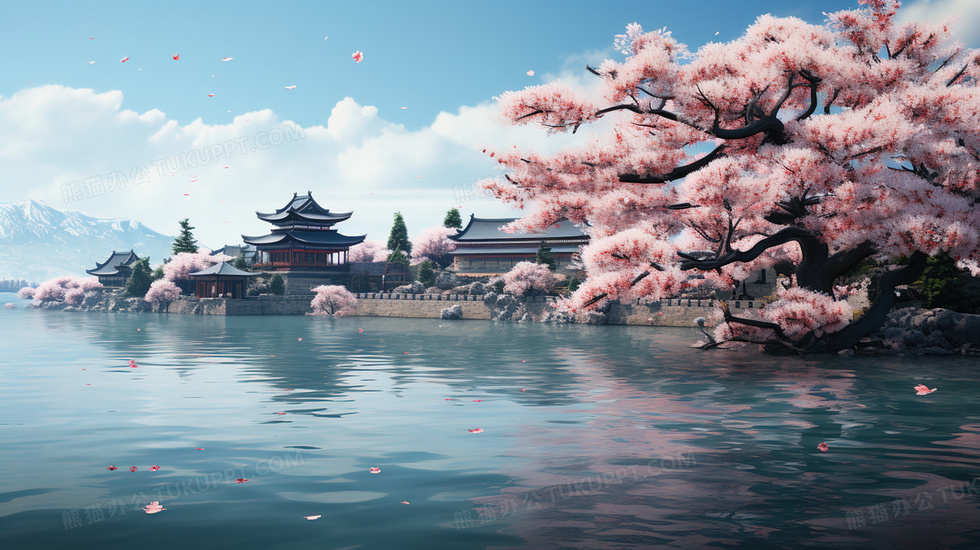本作品内容为唯美湖畔的桃花树和中式园林建筑创意插画, 格式为 jpg, 大小6 MB, 图片尺寸为2912 x 1632, 源文件无水印, 欢迎使用熊猫办公。 如认为平台内容涉嫌侵权,可通过邮件:tousu@tukuppt.com提出书面通知,我们将及时处理。