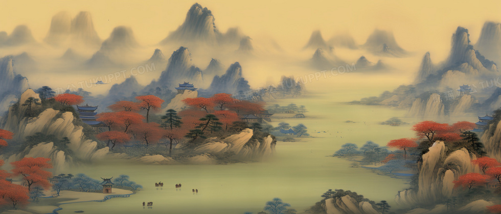 本作品内容为古朴雅致大气中国风千里江山图山水画, 格式为 jpg, 大小6 MB, 图片尺寸为3360 x 1440, 源文件无水印, 欢迎使用熊猫办公。 如认为平台内容涉嫌侵权,可通过邮件:tousu@tukuppt.com提出书面通知,我们将及时处理。