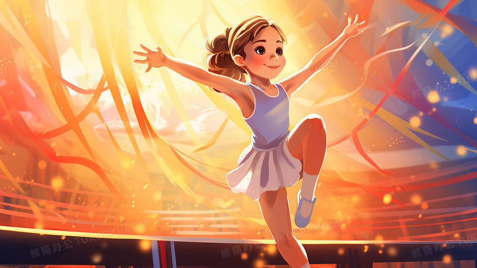 本作品内容为可爱的赛场上的体操小女孩插画, 格式为 jpg, 大小5 MB, 图片尺寸为2912 x 1632, 源文件无水印, 欢迎使用熊猫办公。 如认为平台内容涉嫌侵权,可通过邮件:tousu@tukuppt.com提出书面通知,我们将及时处理。