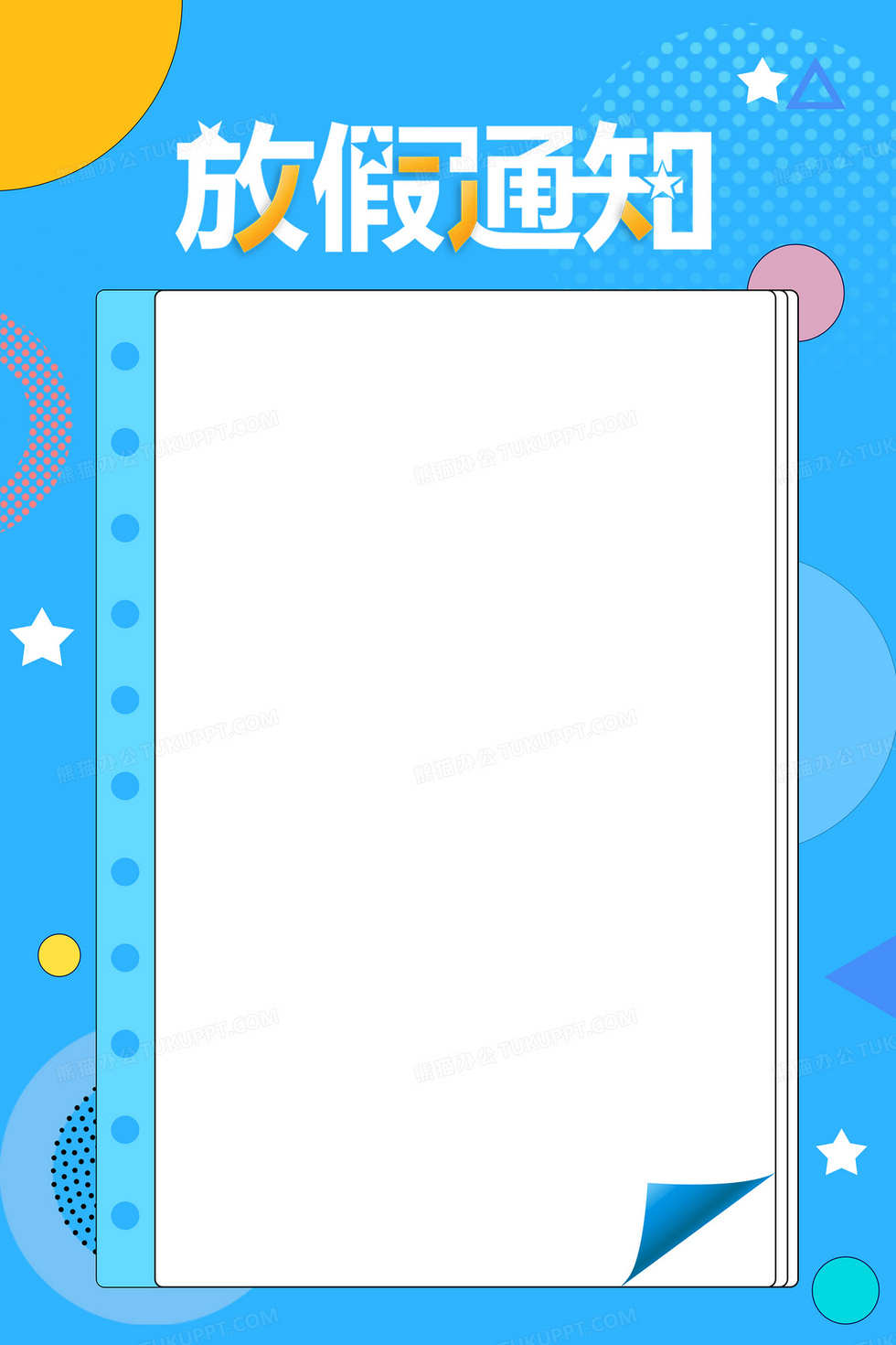 本作品内容为简约扁平几何放假通知边框背景, 格式为 psd, 大小4 MB, 图片尺寸为3543 x 5315, 作品中背景图片无需修改, 源文件无水印,可以直接使用, 欢迎使用熊猫办公。 如认为平台内容涉嫌侵权,可通过邮件:tousu@tukuppt.com提出书面通知,我们将及时处理。