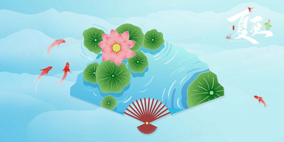 本作品内容为夏至创意荷花金鱼节气插画背景, 格式为 psd, 大小17 MB, 图片尺寸为4724 x 2362, 作品中背景图片无需修改, 源文件无水印,可以直接使用, 欢迎使用熊猫办公。 如认为平台内容涉嫌侵权,可通过邮件:tousu@tukuppt.com提出书面通知,我们将及时处理。