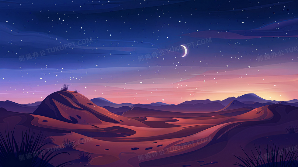 本作品内容为卡通夜晚沙漠背景, 格式为 jpg, 大小4 MB, 图片尺寸为2912 x 1632, 作品中背景图片无需修改, 源文件无水印,可以直接使用, 欢迎使用熊猫办公。 如认为平台内容涉嫌侵权,可通过邮件:tousu@tukuppt.com提出书面通知,我们将及时处理。