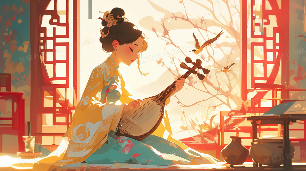 本作品内容为坐窗边弹琵琶的古风少女插画, 格式为 jpg, 大小3 MB, 图片尺寸为2912 x 1632, 源文件无水印, 欢迎使用熊猫办公。 如认为平台内容涉嫌侵权,可通过邮件:tousu@tukuppt.com提出书面通知,我们将及时处理。