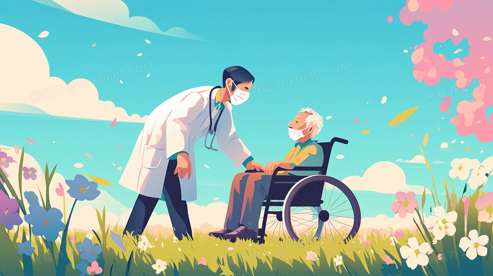 本作品内容为医生照顾生病的坐轮椅老人插画, 格式为 jpg, 大小2 MB, 图片尺寸为2912 x 1632, 源文件无水印, 欢迎使用熊猫办公。 如认为平台内容涉嫌侵权,可通过邮件:tousu@tukuppt.com提出书面通知,我们将及时处理。