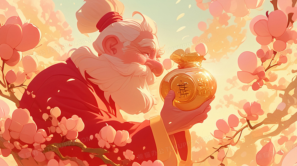 本作品内容为粉色树下拿着金钱袋的财神插画, 格式为 jpg, 大小3 MB, 图片尺寸为2912 x 1632, 源文件无水印, 欢迎使用熊猫办公。 如认为平台内容涉嫌侵权,可通过邮件:tousu@tukuppt.com提出书面通知,我们将及时处理。