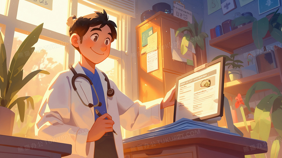 本作品内容为看检查报告的青年男医生插画, 格式为 jpg, 大小2 MB, 图片尺寸为2912 x 1632, 源文件无水印, 欢迎使用熊猫办公。 如认为平台内容涉嫌侵权,可通过邮件:tousu@tukuppt.com提出书面通知,我们将及时处理。