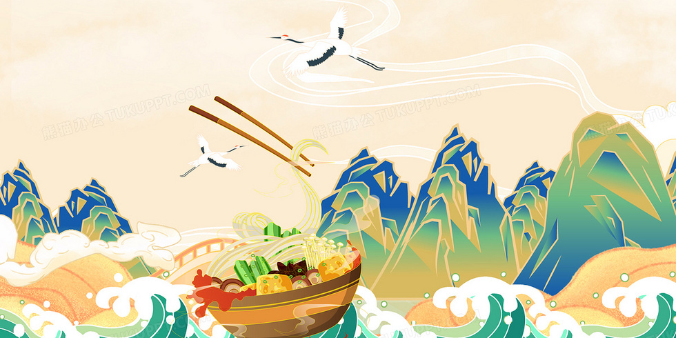 本作品内容为中国风国潮山水面食背景, 格式为 psd, 大小35 MB, 图片尺寸为4724 x 2362, 作品中背景图片无需修改, 源文件无水印,可以直接使用, 欢迎使用熊猫办公。 如认为平台内容涉嫌侵权,可通过邮件:tousu@tukuppt.com提出书面通知,我们将及时处理。