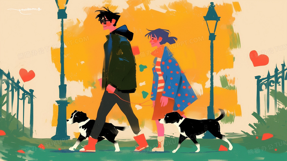 本作品内容为一对情侣牵着爱犬在公园散步插画, 格式为 jpg, 大小5 MB, 图片尺寸为2912 x 1632, 源文件无水印, 欢迎使用熊猫办公。 如认为平台内容涉嫌侵权,可通过邮件:tousu@tukuppt.com提出书面通知,我们将及时处理。