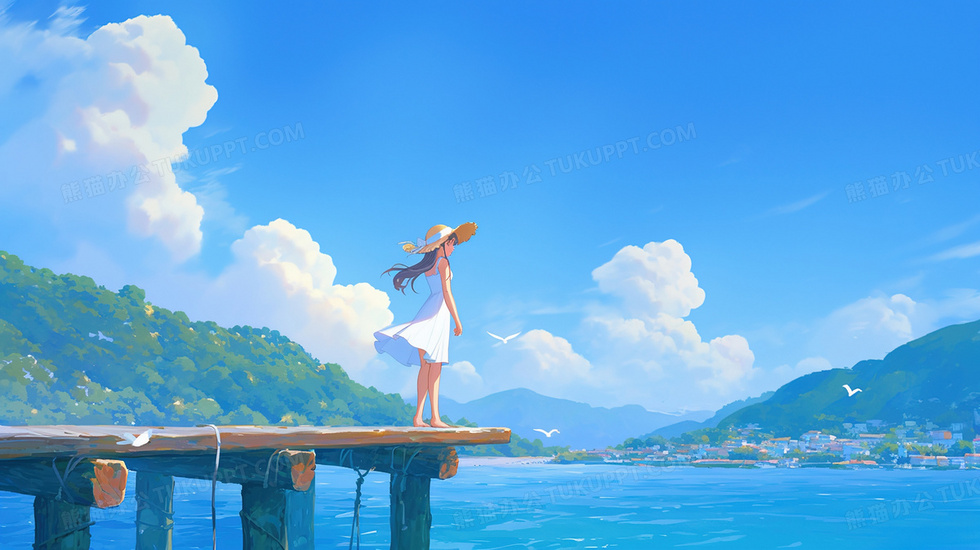 本作品内容为夏日海边度假的文艺女青年插画, 格式为 jpg, 大小3 MB, 图片尺寸为2912 x 1632, 源文件无水印, 欢迎使用熊猫办公。 如认为平台内容涉嫌侵权,可通过邮件:tousu@tukuppt.com提出书面通知,我们将及时处理。