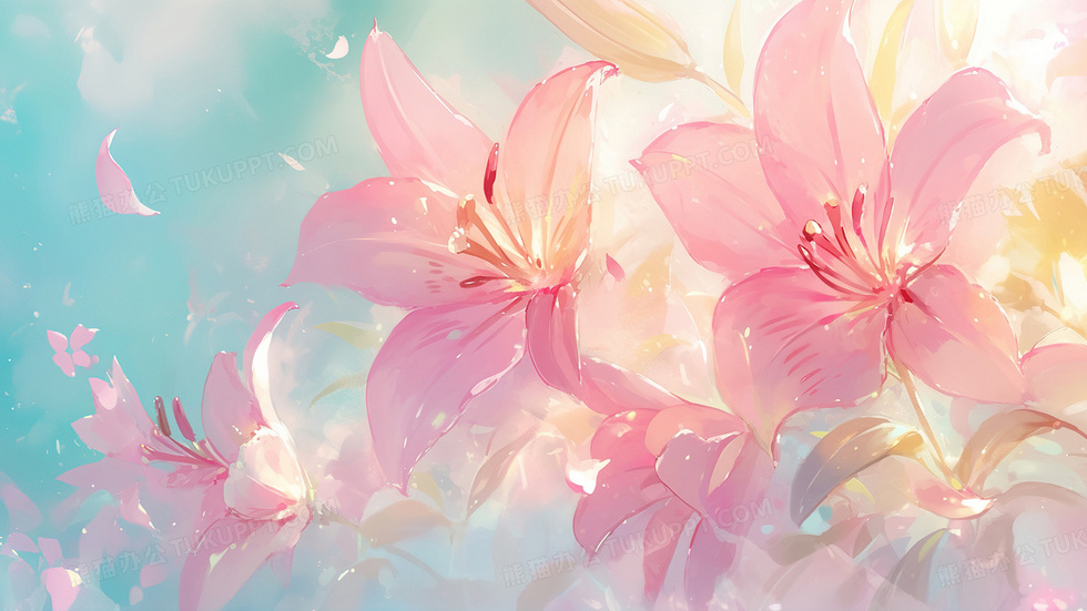 本作品内容为唯美清新百合花粉色花插画, 格式为 jpg, 大小3 MB, 图片尺寸为2880 x 1620, 源文件无水印, 欢迎使用熊猫办公。 如认为平台内容涉嫌侵权,可通过邮件:tousu@tukuppt.com提出书面通知,我们将及时处理。