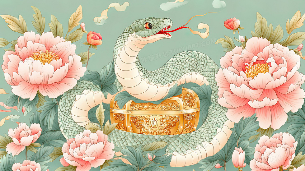本作品内容为蛇年招财宝箱牡丹花卉与蛇插画, 格式为 jpg, 大小4 MB, 图片尺寸为2912 x 1632, 源文件无水印, 欢迎使用熊猫办公。 如认为平台内容涉嫌侵权,可通过邮件:tousu@tukuppt.com提出书面通知,我们将及时处理。
