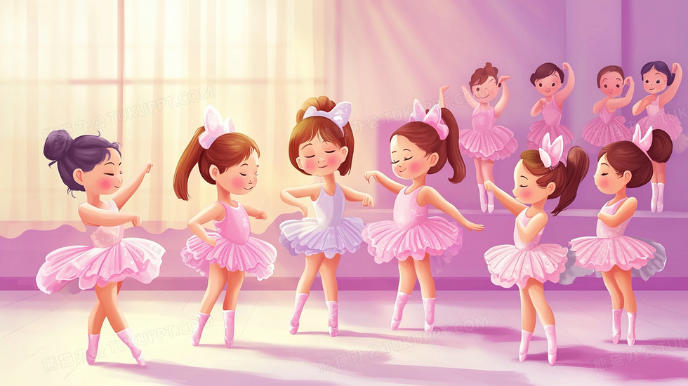 本作品内容为舞蹈室跳芭蕾舞的女孩子插画, 格式为 jpg, 大小2 MB, 图片尺寸为2912 x 1632, 源文件无水印, 欢迎使用熊猫办公。 如认为平台内容涉嫌侵权,可通过邮件:tousu@tukuppt.com提出书面通知,我们将及时处理。