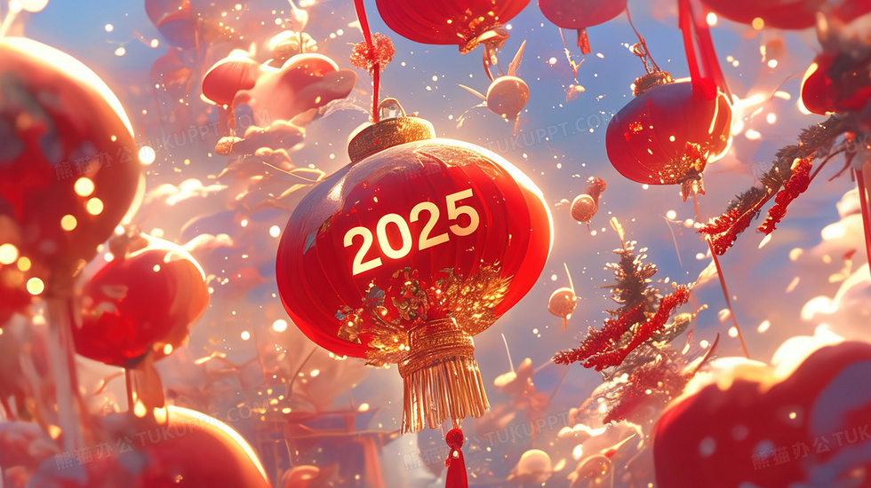 本作品内容为喜庆2025新年灯笼挂饰插画, 格式为 jpg, 大小3 MB, 图片尺寸为2912 x 1632, 源文件无水印, 欢迎使用熊猫办公。 如认为平台内容涉嫌侵权,可通过邮件:tousu@tukuppt.com提出书面通知,我们将及时处理。
