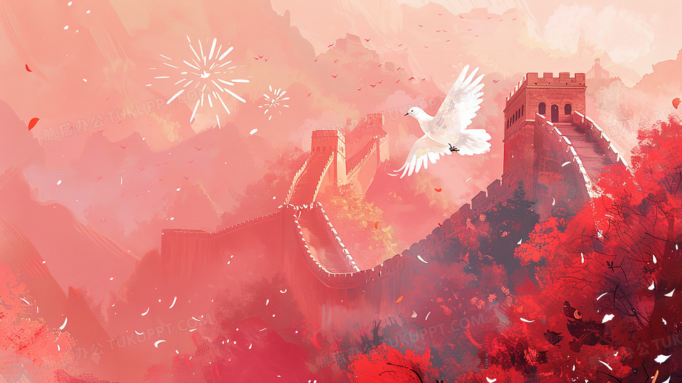 本作品内容为国庆红色背景和平鸽长城烟花喜庆插画, 格式为 jpg, 大小3 MB, 图片尺寸为2912 x 1632, 源文件无水印, 欢迎使用熊猫办公。 如认为平台内容涉嫌侵权,可通过邮件:tousu@tukuppt.com提出书面通知,我们将及时处理。