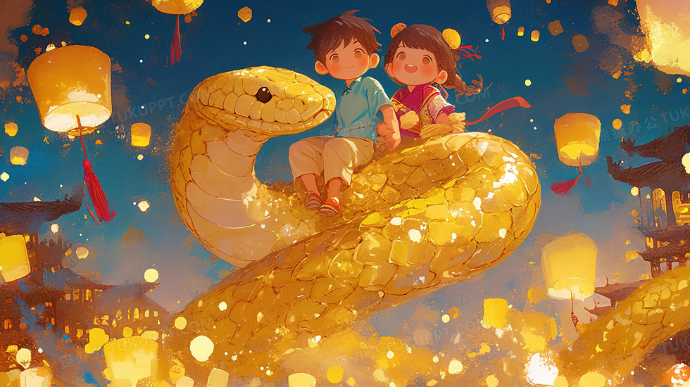 本作品内容为蛇年坐在金色蛇身上的小孩子创意插画, 格式为 jpg, 大小4 MB, 图片尺寸为2912 x 1632, 源文件无水印, 欢迎使用熊猫办公。 如认为平台内容涉嫌侵权,可通过邮件:tousu@tukuppt.com提出书面通知,我们将及时处理。