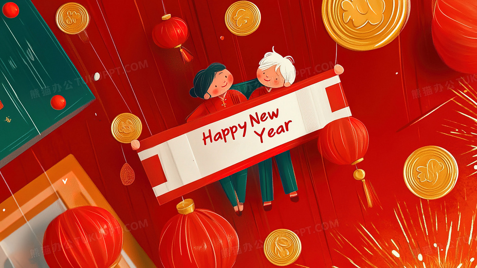 本作品内容为卡通人物在红色背景上的喜庆插画, 格式为 jpg, 大小3 MB, 图片尺寸为2912 x 1632, 源文件无水印, 欢迎使用熊猫办公。 如认为平台内容涉嫌侵权,可通过邮件:tousu@tukuppt.com提出书面通知,我们将及时处理。