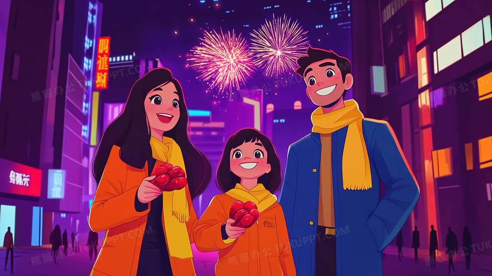 本作品内容为一家人在街上吃零食看烟花开心插画, 格式为 jpg, 大小3 MB, 图片尺寸为2912 x 1632, 源文件无水印, 欢迎使用熊猫办公。 如认为平台内容涉嫌侵权,可通过邮件:tousu@tukuppt.com提出书面通知,我们将及时处理。