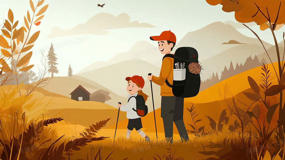 本作品内容为秋天父女在户外徒步旅行插画, 格式为 jpg, 大小3 MB, 图片尺寸为2912 x 1632, 源文件无水印, 欢迎使用熊猫办公。 如认为平台内容涉嫌侵权,可通过邮件:tousu@tukuppt.com提出书面通知,我们将及时处理。